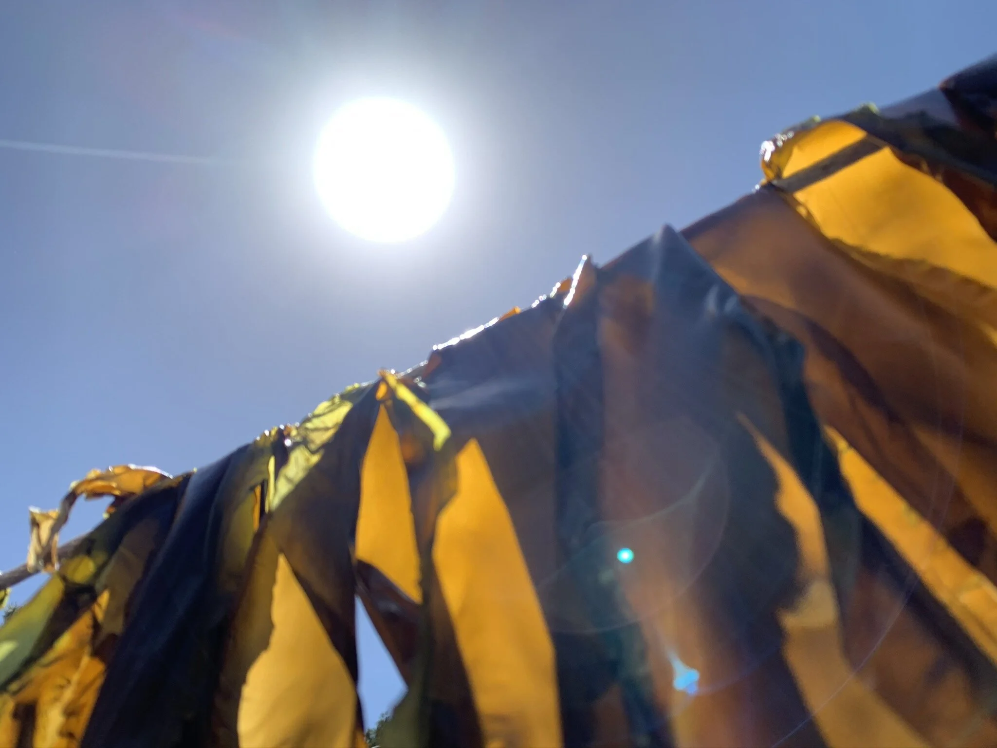 In our experience of processing the first two batches, I discovered the residue that dried sugar kelp leaves behind - a soft, delicate, sweet, umami, salty powder - that would collect in the smallest piles under the crates as they'd shift from stacking and re-stacking. Sugar kelp gets its name from the sweet mannitol that comes to the surface of the blades when they dry. As we dragged our third batch into the front yard, I knew what I was after. On a hot, clear Sunday, I found myself tapping the crates of dried stalks on our brick patio and into a sheet- sweeping the dust into a small, hopeful pile with a silicone barbeque sauce brush. The wind would pick up slightly as I did this, and I'd newly wonder each time if my pile would survive. My mind drifted to the thought of Justin, traversing across the Atlantic at age 10 on a sailboat with his father and a few other sailors. 6 weeks on the open ocean under the sun- how much time he must have spent thinking about the wind and what it might decide to do next. To be at the hands of an entire ocean- I often wonder how much of the quiet, thoughtful patience you can see in him today was shaped by that trip- the kind of patience a person carries when they understand there are forces at play well beyond the perception of their control.